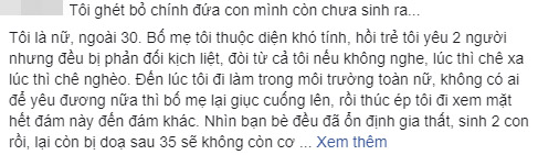 Tâm sự của cô gái nhận được sự đồng cảm của nhiều người. Cô đang mang thai nhưng vì hận bố đứa trẻ lại ghét lây đứa con còn chưa kịp chào đời. Dù biết trẻ con không có tội nhưng sự thật bị lừa dối thật chua xót và cay đắng khiến cô cảm thấy không cam tâm sinh con ra, không nỡ bỏ con nhưng lại lo sợ bản thân sẽ không thể đối xử tốt với nó?