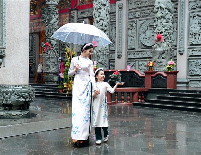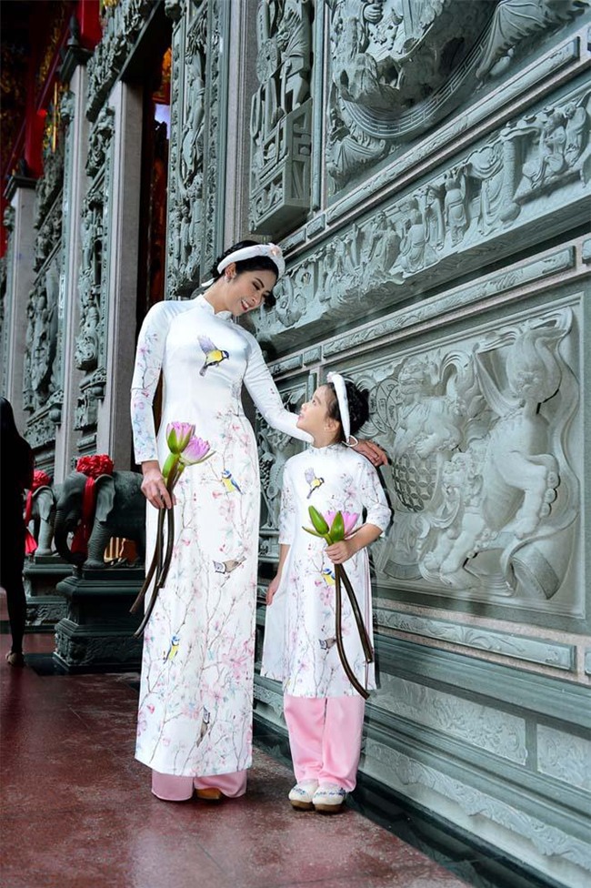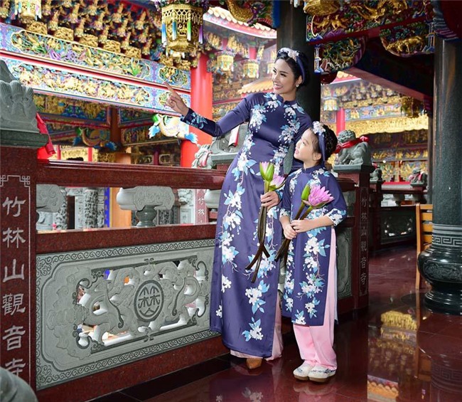Khi ghé thăm ngôi chùa Quan Âm ở núi Trúc Lâm, người đẹp đã diện các trang phục áo dài mà cô tự thiết kế.