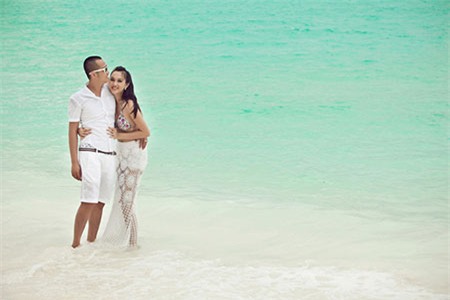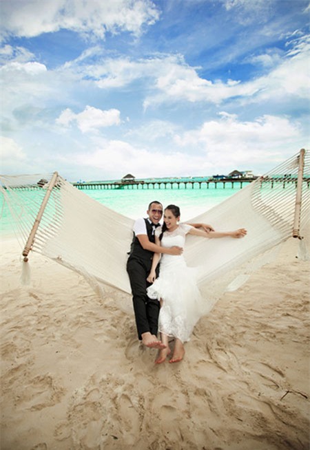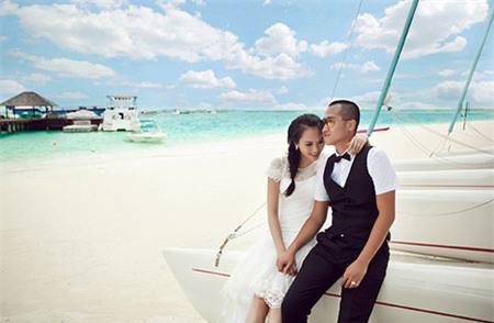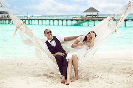 | Bên cạnh những shot hình cưới vui vẻ, vợ chồng Ngọc Thạch còn có những khoảnh khắc lãng mạn trên bờ cát trắng mịn của Maldives.  |