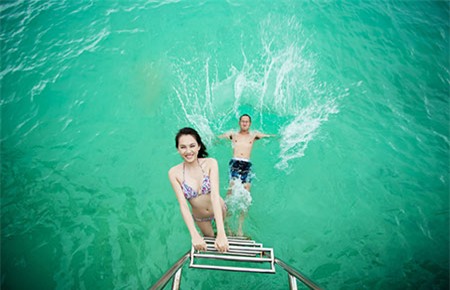 | Siêu mẫu sở hữu gương mặt khả ái và thân hình lý tưởng nên cô không ngần ngại mặc bikini, khoe đường cong bên ông xã Bình Dương.  |