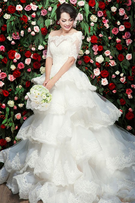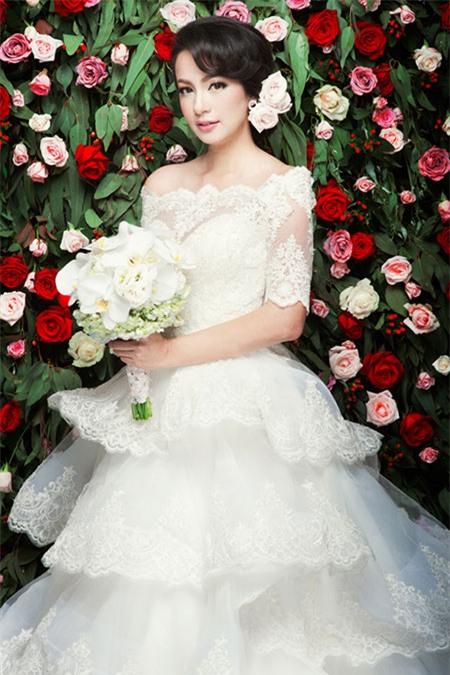 Cựu người mẫu xinh đẹp khoe vai trần gợi cảm với váy cưới xếp tầng. |