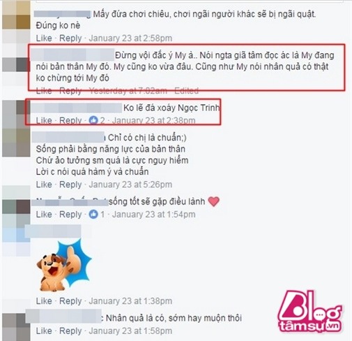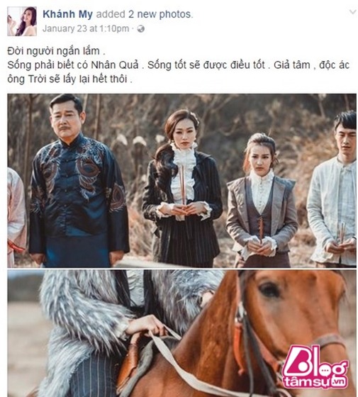 Sáng 23/1, Hoàng Kiều viết thông báo trên trang Facebook chấm dứt mối quan hệ với Ngọc Trinh. Vô tình chiều cùng ngày, Khánh My đã viết trên trang cá nhân: “Đời người ngắn lắm! Sống phải biết có nhân quả. Sống tốt sẽ được điều tốt. Giả tâm, độc ác ông trời sẽ lấy lại hết thôi!”. Câu nói vu vơ, vô thưởng vô phạt này rất bình thường, không hề ảnh hưởng đến ai, nhưng lại thốt ra đúng ngày Ngọc Trinh đang ‘gặp nạn’ nên nhiều người nghi ngờ rằng, Khánh My đang đá xoáy tình địch của mình.