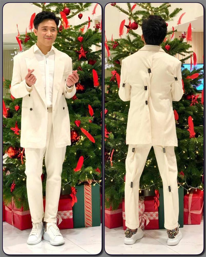 Trấn Thành “chữa cháy” cho bộ đồ rộng thênh bằng cách dùng kẹp giấy từ trên xuống dưới. Nhìn phía trước anh trông bảnh bao là thế, chỉ khi xoay người ra sau, độ “lầy” của nam MC mới bị tiết lộ.