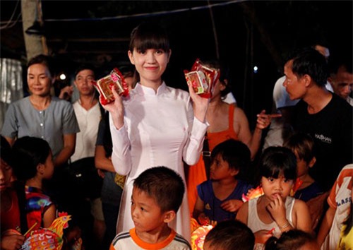 Ngọc Trinh tận hưởng không khí thân tình bên các đồng nghiệp và các em nhỏ.