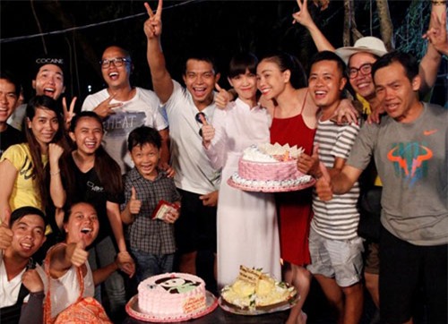 Ngọc Trinh thổi nến mừng tuổi 25. Đạo diễn Vũ Ngọc Đãng và đoàn phim quây quần chúc mừng người đẹp.