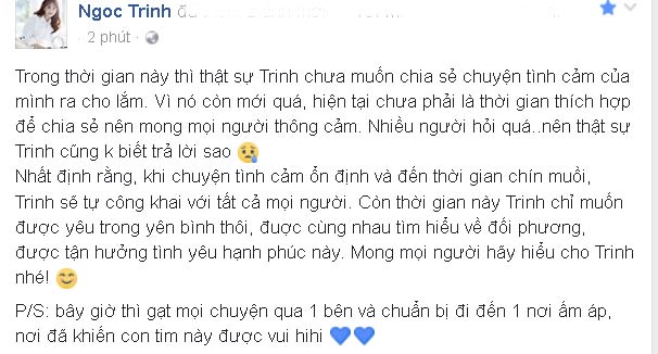 Nhất định rằng, khi chuyện tình cảm ổn định và đến thời gian chín muồi, Trinh sẽ tự công khai với tất cả mọi người. Còn thời gian này Trinh chỉ muốn được yêu trong yên bình thôi, đuợc cùng nhau tìm hiểu về đối phương, được tận hưởng tình yêu hạnh phúc này. Mong mọi người hãy hiểu cho Trinh nhé!