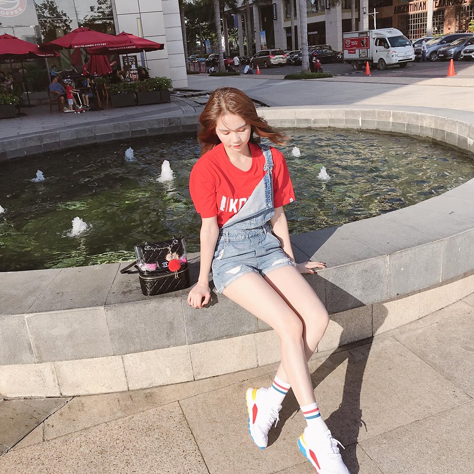 Người đẹp ăn gian tuổi bằng công thức mix đồ áo phông, yếm jeans kết hợp giầy sneaker, balo Chanel.