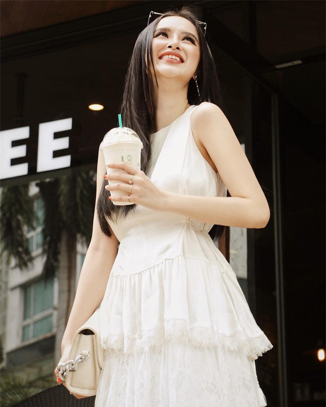 Từ ngày chuyển sang mái tóc đen tuyền để dài thướt tha, Angela Phương Trinh hiền lành và nữ tính hơn hẳn. Bộ váy trắng với chi tiết xếp tầng điệu đà cực kỳ hợp với vẻ ngoài xinh xắn thơ ngây mà mái tóc đen tuyền mang đến cho cô.