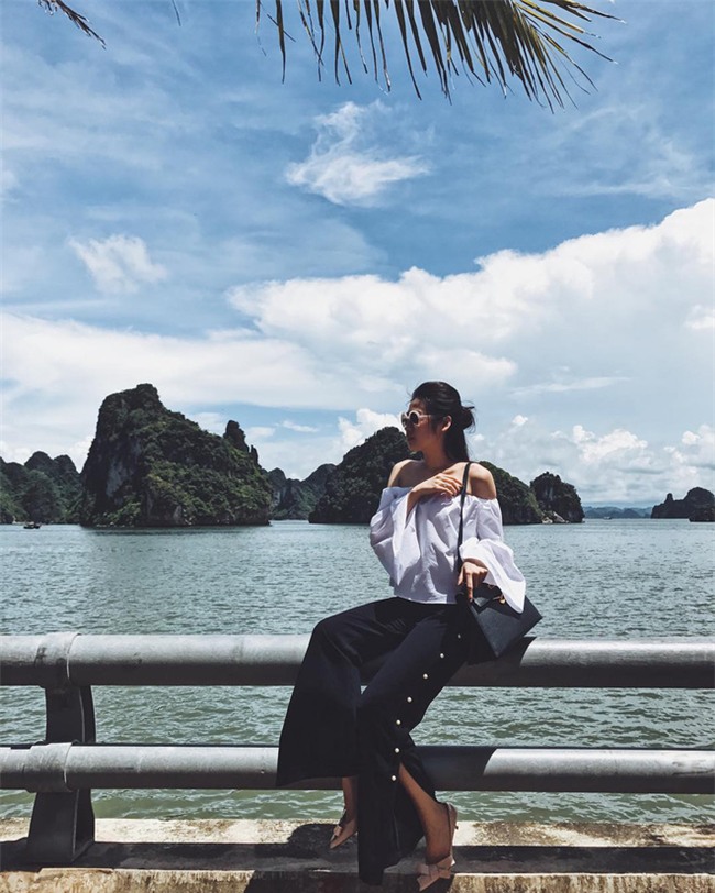 Á hậu Tú Anh tận hưởng chuyến du lịch hè sôi động. Áo trễ vai tiếp tục là món đồ được nàng Á hậu lựa chọn cho chuyến đi của mình. Kết hợp cùng áo cô không chọn chân váy hay short mà lại diện quần ống rộng xẻ gấu lấp ló đôi chân thon dài mướt mắt.
