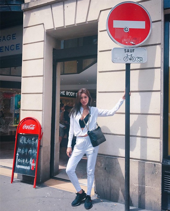 Ngọc Tinh trong chuyến lưu diễn Berlin của "Đêm hội chân dài" tranh thủ khung cảnh lãng mạn của trời tây để khoe phong cách street style của mình. Hôm đầu tiên đặt chân đến nước Đức, Ngọc Trinh chọn cho mình một set đồ đậm chất thể thao khỏe khoắn không kém phần gợi cảm khi khoác áo hờ hững khoe khéo vòng 1 nóng bỏng với áo ba lỗ ôm sát.