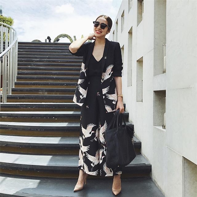 Hà Tăng lâu lắm mới thấy xuất hiện, nhưng một khi đã xuất hiện là ăn đứt các người đẹp khác. Mẹ hai con khoe vóc dáng thon gọn trong một set đồ thời thượng thanh lịch với bộ suit cách điệu in hình chim hạc sắc nét.