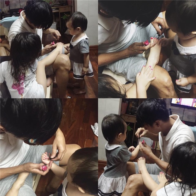 Ca sĩ Lý Hải chăm chú ngồi làm nail cho hai con gái. Vợ Lý Hải chia sẻ: Ra đường làm đạo diễn - diễn viên - ca sĩ, về nhà chuyển nghề làm nail. Đang phục vụ 2 khách hàng VIP của năm. Chỉ có ba mới chiều 2 cô con gái thế. Người ta bảo con gái là người tình kiếp trước của ba là sai rồi. Còn hơn cả người tình ấy. Chứ mẹ Hà từ hồi iu nhau tới giờ có bao giờ được ba Hải làm nail cho vậy đâu.