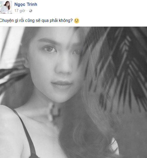 Mới đây, những bức hình thân mật của Ngọc Trinh và người tình tỷ phú ở Mỹ cũng được hé lộ thêm khiến nhiều người ghen tị với Nữ hoàng nội y. Ngọc Trinh cảm thấy mệt mỏi bởi lùm xùm chuyện tình cảm với tỷ phú Hoàng Kiều thời gian gần đây. Cô chỉ chia sẻ ngắn ngọc trên trang cá nhân: " “Chuyện gì rồi cũng sẽ qua phải không?”. Nhiều fan hâm mộ gửi lời động viên tới người đẹp sinh năm 1989.