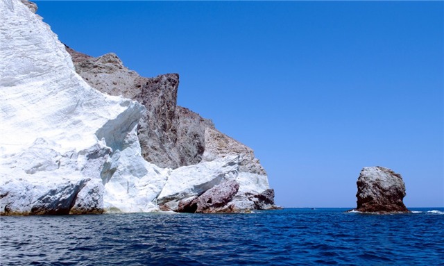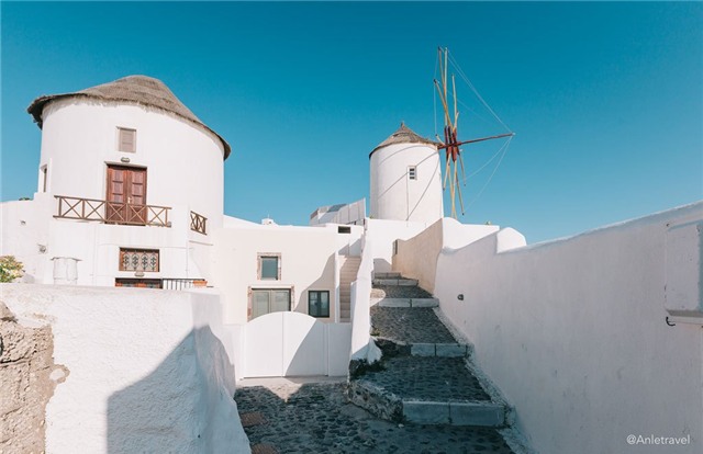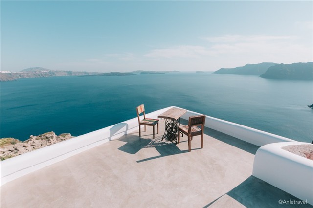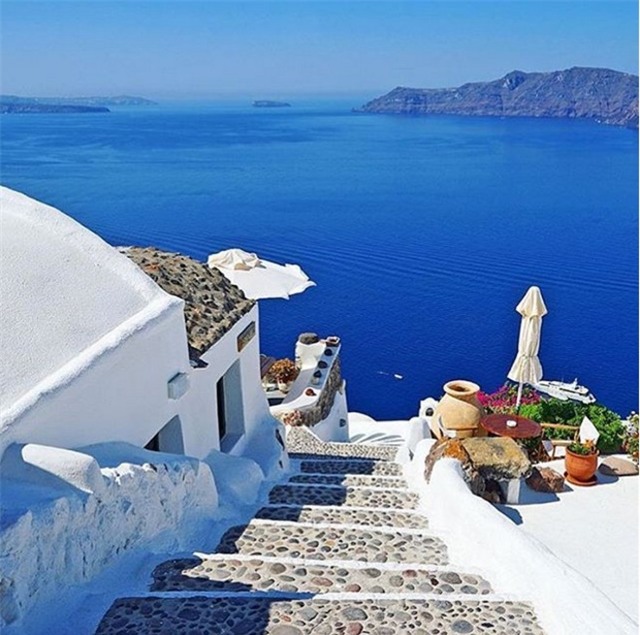 nấm trắng li ti nổi lên giữa nền xanh Địa Trung Hải. Santorini cũng sở hữu sắc xanh đặc biệt của nước biển và bầu trời.