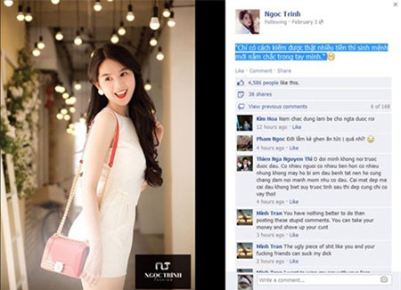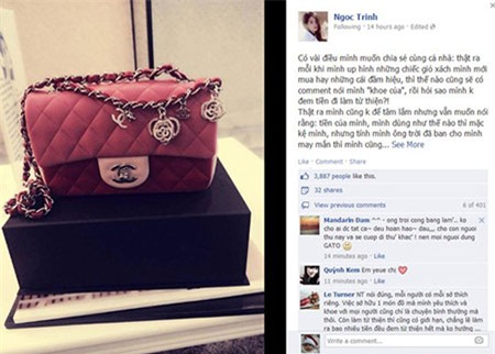 Ngọc Trinh luôn theo sát những bình luận về mình trên các diễn đàn. Trên trang facebook cá nhân, người đẹp miền Tây vừa chia sẻ: "Thật ra mỗi khi mình up hình những chiếc giỏ xách mình mới mua hay những cái đầm hiệu, thì thế nào cũng sẽ có comment nói mình "khoe của", rồi hỏi sao mình không đem tiền đi làm từ thiện?