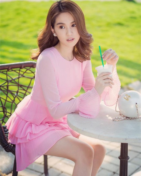 Trong bộ đầm hồng “bánh bèo”, nữ diễn viên Vòng eo 56 lựa chọn son màu hồng nude nhạt.