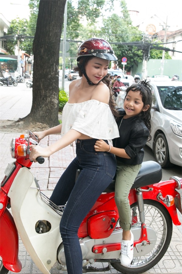 Trà Ngọc Hằng dùng xe cub cổ điển đèo "con gái" trong bộ phim "Khi mẹ làm cha" đến địa điểm tổ chức họp fans.