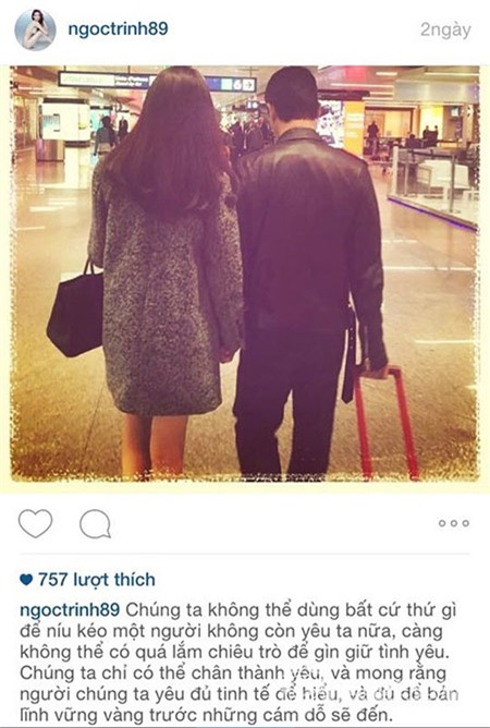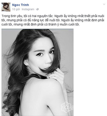 Ngọc Trinh luôn nổi tiếng với công chúng không chỉ bởi xinh đẹp, thành công mà còn vì những phát ngôn gây sốc. Mới đây, "Nữ hoàng nội y" tiếp tục chia sẻ hai nguyên tắc trong tình yêu, cô nói: "Trong tình yêu, tôi có hai nguyên tắc: Người ấy không nhất thiết phải nuôi tôi, nhưng phải có đủ năng lực để nuôi tôi. Người ấy không nhất định phải cưới tôi, nhưng nhất định phải có thành ý muốn cưới tôi".