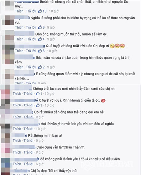 Ngay sau lời chia sẻ, rất nhiều công chúng tỏ lời đồng tình với Ngọc Trinh: "Quá tuyệt vời"; "Thoải mái nhưng vẫn rất chân thật. Em thích hai nguyên tắc này"; "Em cũng đồng quan điểm với chị ý"...