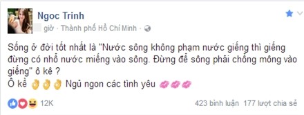 Ngay sau tâm tư của đàn anh, Ngọc Trinh nhanh chóng đăng đàn sâu cay: "Sống ở đời tốt nhất là: 'Nước sông không phạm nước giếng thì giếng đừng nhổ nước miếng vào sông. Đừng để sông phải chổng mông vào giếng'. Oki?".
