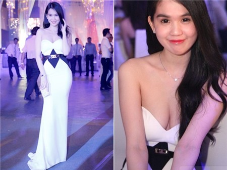 trong bộ đầm trắng cúp ngực. |