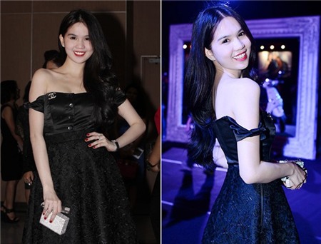 thế da trắng, vai thon, bộ ngực đầy đặn trong bộ váy đen trễ vai. |