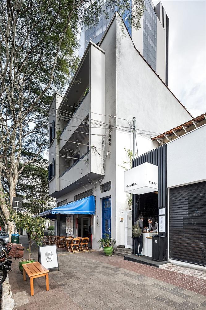 Mặt trước của quán được phủ màu trắng với khung kim loại màu đen bên cạnh cho phép nó hòa quyện với mặt tiền đường phố xung quanh.