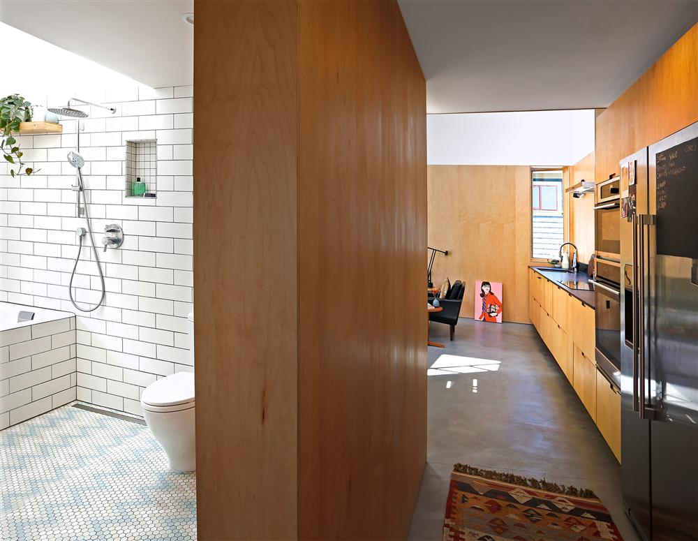 Bên trong ngôi nhà được thiết kế với nội thất bằng gỗ là chủ đạo. Gác lửng được thiết kế tràn ngập ánh sáng.