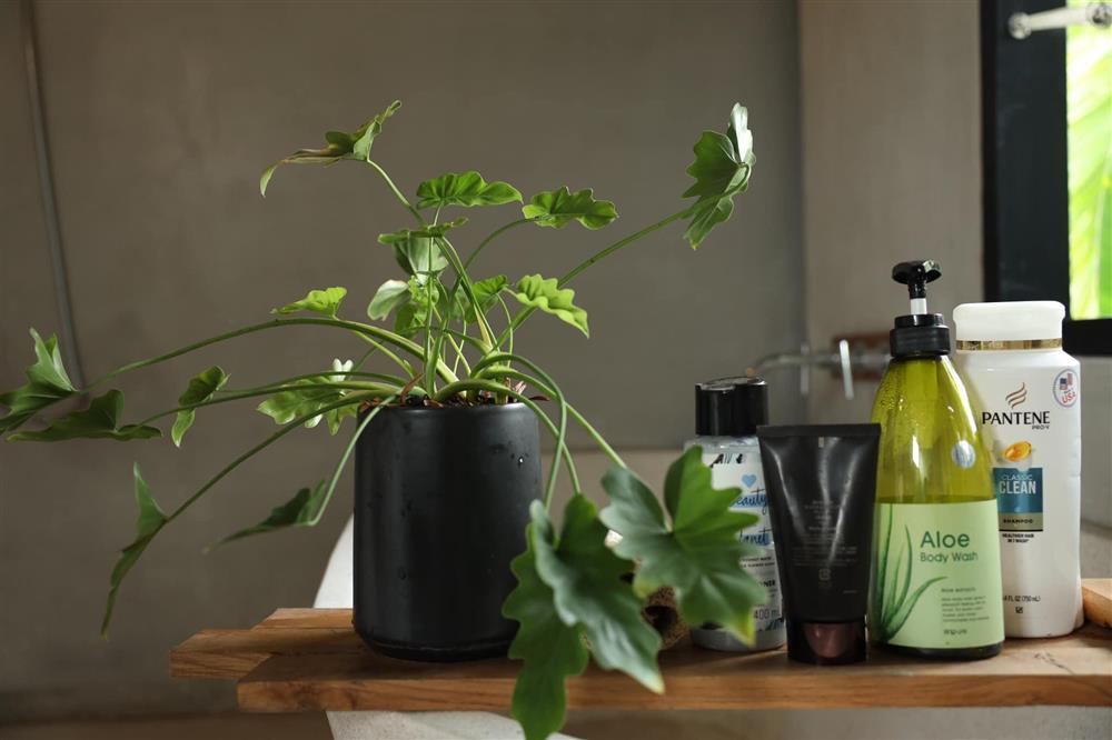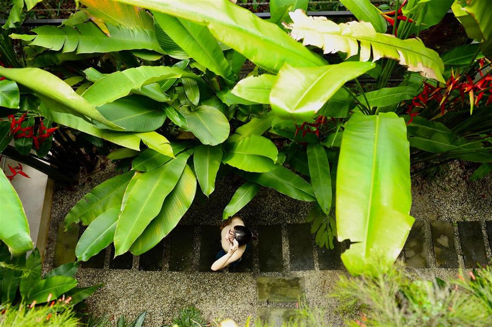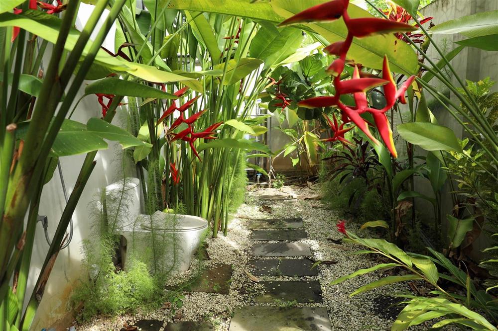 Phòng tắm ngoài trời, bên những rặng chuối xanh và hàng cây hoa thiên điểu rực rỡ. Mặc dù là ngoài trời nhưng khu vực này có tường bao khá kín đáo, riêng tư.