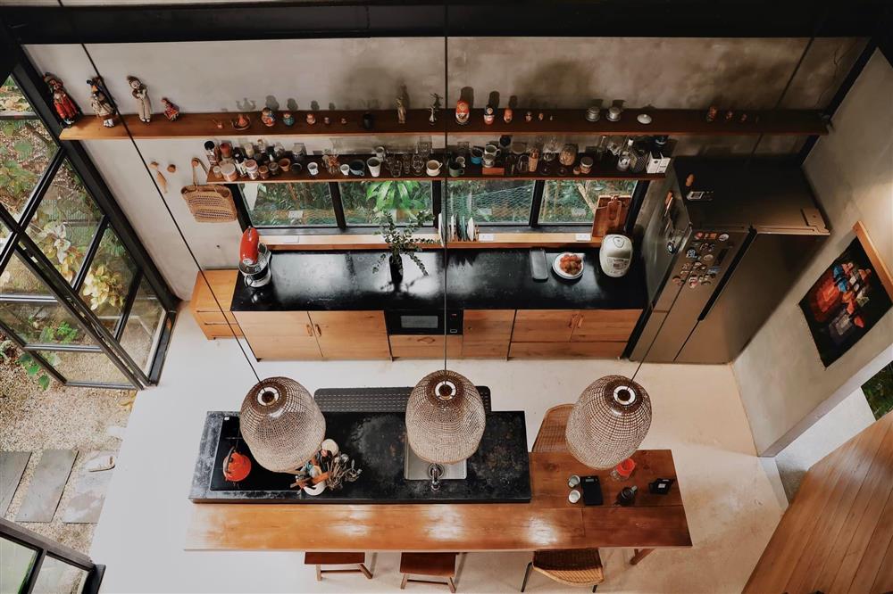 Nhà thiết kế hiện đại nhưng mang vẻ gần gũi, mộc mạc và có chút xưa cũ thông qua các mảng tường sơn hiệu ứng giả bê-tông, nội thất gỗ. Căn bếp mở ấm áp, được bạn bè chị Bích yêu thích, tụ tập mỗi cuối tuần. Phòng ngủ hướng ra sân vườn nhiều mảng xanh.