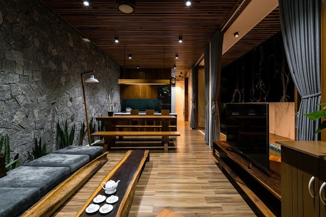 Phòng khách có một mặt được mở hoàn toàn, giúp ngôi nhà luôn khô ráo trong khí hậu ẩm vào mùa mưa.