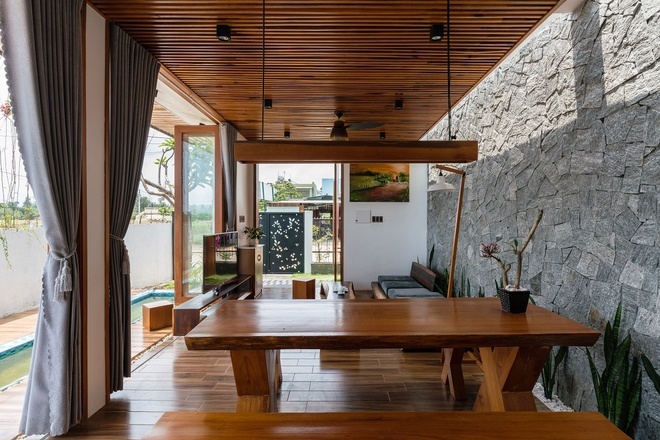 Phòng khách và bếp thuộc khối đằng trước của ngôi nhà.