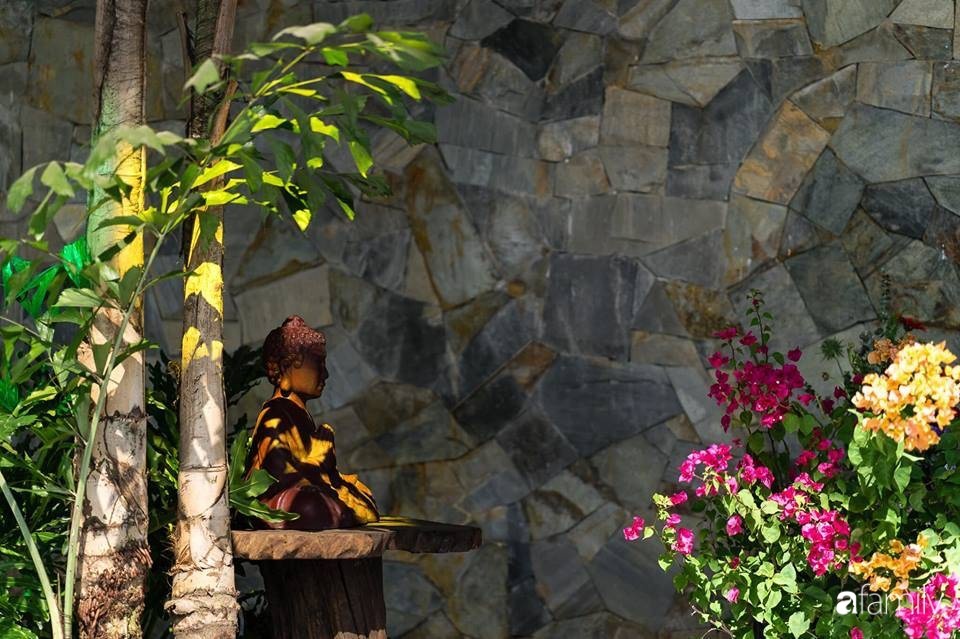 Vì là người tín Phật nên chủ nhân thành tâm đặt tượng Phật dưới tán cây lớn ở phòng khách. Không gian được bao phủ xung quanh với sự tĩnh tại, bóng nắng, cây và hoa.