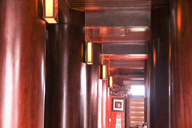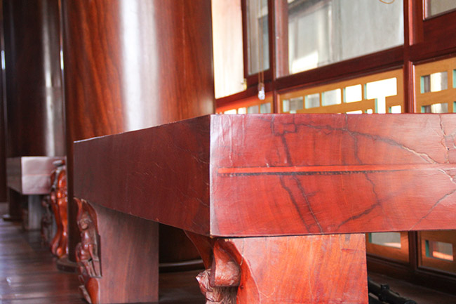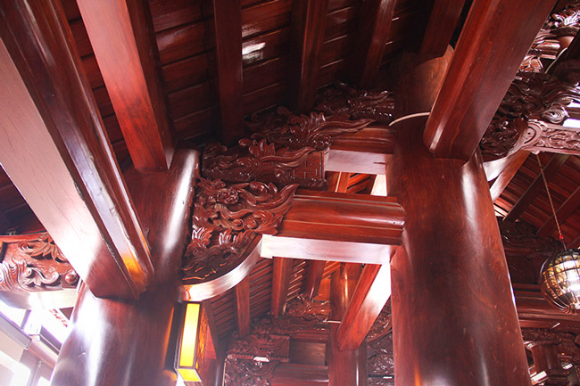 Gỗ chủ yếu là gỗ Sao xanh, một trong những loại gỗ tốt và chịu được mối mọt cao. “Tổng số 22 cột, trong đó có 6 cột chính giữ cao tới 17,5m. Đường kính trung bình mỗi cột từ 70 -90cm” – chủ nhân ngôi nhà cho hay.