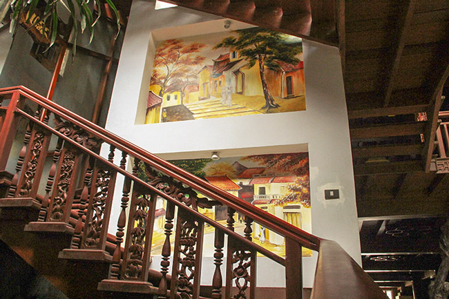 Tại mỗi chiếu nghỉ ở cầu thang, gia chủ trang trí bằng những bức tranh sơn dầu về phong cảnh, đồng quê... tạo cho không gian ngôi nhà thêm sinh động.