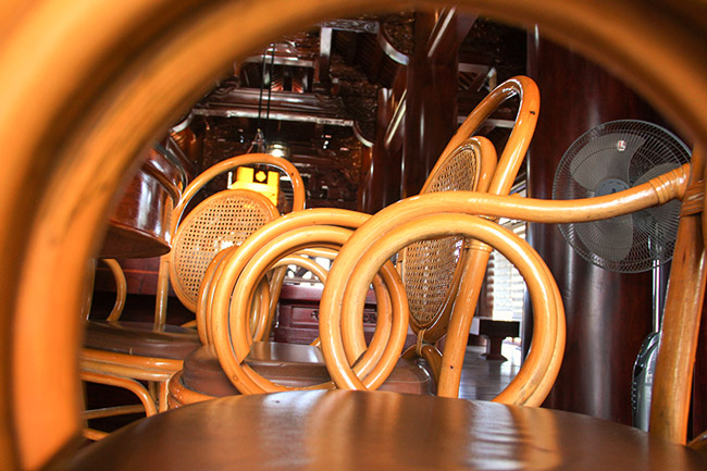 Những chiếc ghế gỗ kết hợp từ cây song.