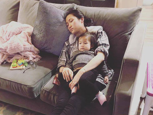 Bức ảnh này được Yến Phương đăng tải trên trang cá nhân và gọi đó là khoảnh khắc mô tả quãng thời gian cô "gục ngã" vì chăm con một mình bên đất Mỹ.
