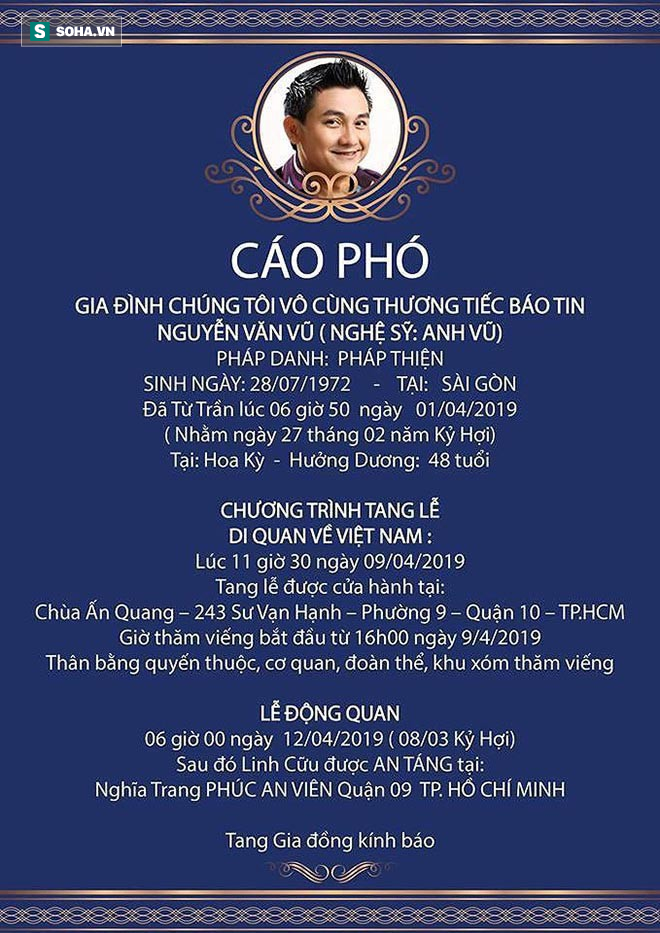 Cáo phó tang lễ cố nghệ sĩ Anh Vũ.