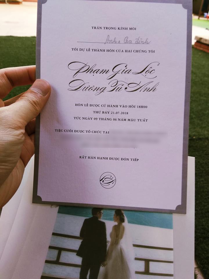 Theo thông tin chi tiết trên thiệp thì đám cưới sẽ được diễn ra vào tối 21/7 ở một trung tâm tiệc cưới hoành tráng tại quận Long Biên, Hà Nội.