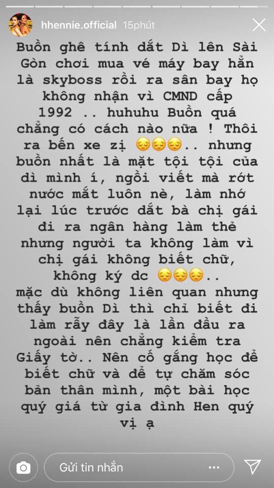 Cụ thể, H'Hen Niê muốn đón dì của mình lên Sài Gòn chơi, cô hí hửng đặt mua vé máy bay để dì được hưởng tiện ích tốt nhất nhưng khi đến nơi thì lại không được lên máy bay vì trục trặc giấy tờ. Nguyên nhân là do chứng minh nhân dân của dì ruột H'hen Niê đã cấp từ năm 1992, đến nay quá cũ và không được hãng bay chấp nhận. Không còn cách nào khác, dì của người đẹp đành phải lủi thủi ra bến xe bắt chuyến lên Sài Gòn thăm cháu.
