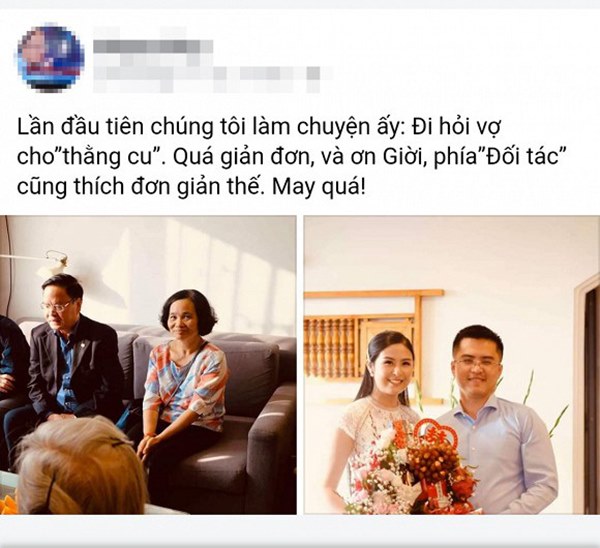 Mới đây, một tài khoản Facebook được cho là của bố chồng tương lai Ngọc Hân đã đăng tải bức ảnh với dòng trạng thái: "Lần đầu tiên chúng tôi làm chuyện ấy. Đi hỏi vợ cho "thằng cu". Quá giản đơn, và ơn giời, phía "đối tác" cũng thích đơn giản thế. May quá!".