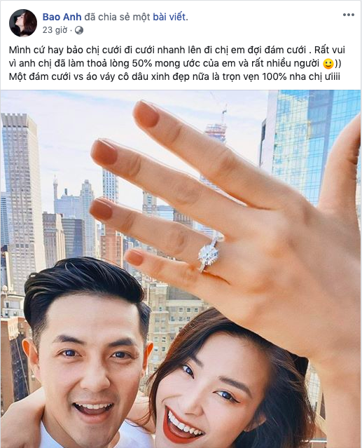 Trước những thông tin này, Bảo Anh đã lần đầu khẳng định về mối quan hệ của cả hai. Cụ thể, Bảo Anh đã chia sẻ ảnh Đông Nhi và Ông Cao Thắng lên trang cá nhân để chúc mừng cặp đôi. Ngay sau đó, Quốc Trường vào bình luận: "Haha", Bảo Anh cũng nhanh chóng đáp lại: "Ủa tự nhiên vô haha". Màn tương tác của cả hai khiến cư dân mạng không khỏi đặt câu hỏi liệu có phải cả hai đang "thả thính" nhau.