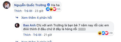 Sau nghi vấn của cư dân mạng, Bảo Anh đã nhanh chóng phản hồi:"Chị với anh Trường là bạn bè 7 năm nay rồi các em ới thính ở đâu chứ ở đây là hỏng rồi".
