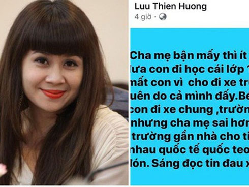 Liên quan đến vụ việc bé trai 6 tuổi tử vong do bị bỏ quên trên xe đưa đón lúc 21h30 ngày 6/8, rất nhiều nghệ sĩ Việt đã chia sẻ đau buồn với gia đình nạn nhân ngay trên mạng xã hội. Cũng bày tỏ quan điểm, nhạc sĩ Lưu Thiên Hươnglại vấp phải rất nhiều ý kiến trái chiều. Theo cô, không chỉ nhà trường mà cha mẹ của em cũng là người có lỗi trong sự việc trên. "Cha mẹ bận mấy thì ít nhất cũng đưa con đi học cái lớp 1 đi. Cái lý do mất con vì cho đi xe trường là do mình cả đấy. Bé xíu mà thả con đi xe chung. Trường cũng sai nhưng cha mẹ sai hơn. Chọn cái trường gần nhà cho tiện đi. Đua nhau quốc tế quốc teo xe đưa xe đón. Sáng đọc tin đau xót mà điên" - Lưu Thiên Hương viết. Sau khi nhận loạt chỉ trích, nữ nhạc sĩ đã khoá trang cá nhân.