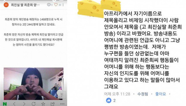 Ban đầu, Choi Joon Hee đã thử sức với vai trò BJ trên kênh trực tuyến nổi tiếng của Hàn Quốc Afreeca bằng chính tên thật của mình, tuy nhiên Choi không thu hút nhiều fan và video của cô cũng không nhận được nhiều lượt xem. Sau đó, Choi Joon Hee đổi tên thành "Kênh của con gái cố nghệ sĩ Choi Jin Sil - Choi Joon Hee" và bắt đầu nhận được phản hồi tích cực từ cư dân mạng. Choi Joon Hee còn dùng ảnh của Choi Jin Sil làm hình đại diện trên trang.