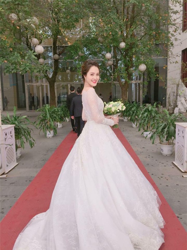 Á hậu mặc áo cưới trắng thướt tha, rạng rỡ cùng ông xã bước vào địa điểm tổ chức tiệc.