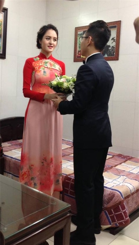 Trong lễ vu quy, Á hậu chọn trang phục áo dài truyền thống.