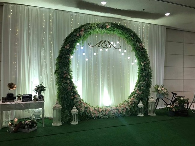 Không gian tiệc cưới được trang hoàng sang trọng lộng lẫy với hoa hồng làm chủ đạo