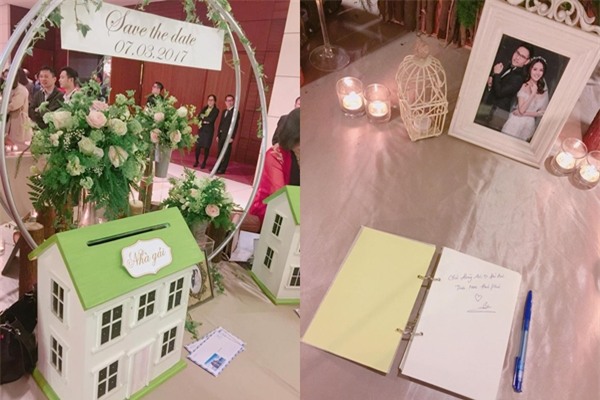 Sau lễ rước dâu, gia đình Hoàng Anh đã tổ chức tiệc đãi khách vào 11h30 cùng ngày tại Trung tâm Hội nghị quốc gia Hà Nội. Không gian tiệc cưới được trang hoàng lộng lẫy với hoa hồng làm chủ đạo. Tại sảnh lớn, bộ ảnh cưới thực hiện tại Sài Gòn của vợ chồng Á hậu Hoàng Anh - Đức Anh được trưng bày với nhiều khoảnh khắc ngọt ngào của đôi trai tài gái sắc.