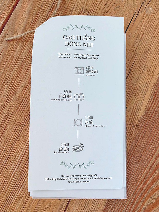 Mới đây thiệp mời đám cưới của Đông Nhi – Ông Cao Thắng được hé lộ. Có thể thấy thiệp mời đám cưới của cặp đôi khá đơn giản nhưng không kém phần sang trọng. Trên thiệp có ghi rõ một số yêu cầu cho khách mời như trang phục màu đen, trắng hoặc kem. Chỉ có những vị khách có tên trong danh sách mới có thể vào bên trong resort Vinpearl Phú Quốc.